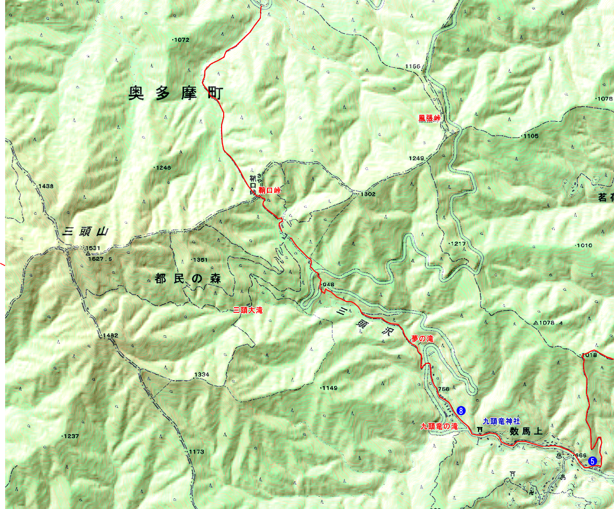 吉祥寺滝 1m 3段 橘峡 龍神の滝 18m (ムジナ滝) 九頭龍の滝 10m (横道の滝)夢の滝 19m (滑滝) 三頭大滝 35m 檜原都民の森 綾滝 21m (泡滝)天狗の滝 38m 払沢の滝遊歩道から遠望できます