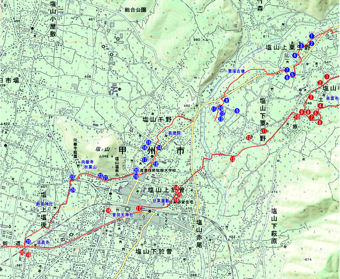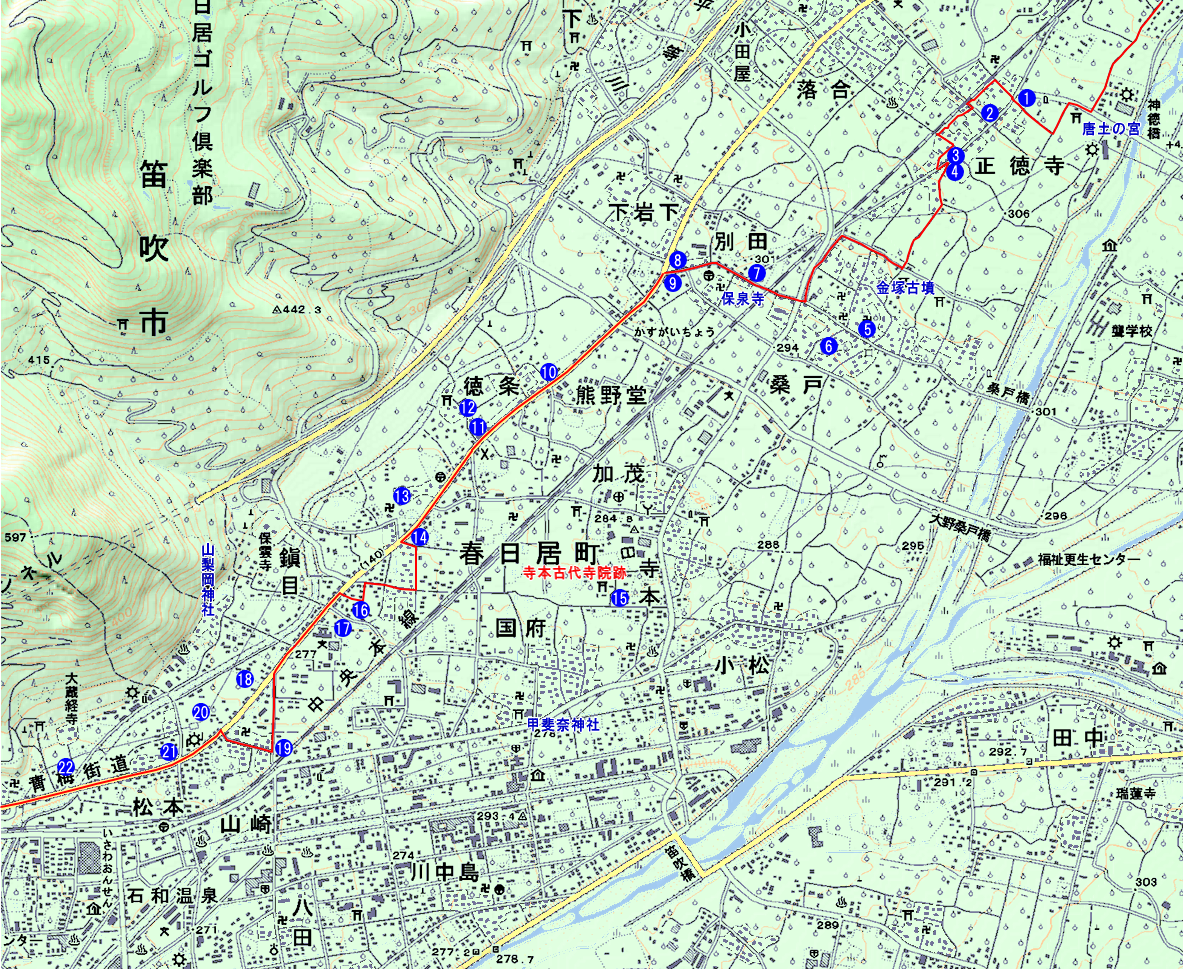 又、二転説・三転説など、考古学的には確定できる実証がありません。古甲州道沿いの春日居国府には古代寺院の寺本古代寺院跡があり、遺構としての寺本心礎は古代からのメッセージを送られているようで圧巻です。また付近は、正東西南北の条里制地割が認められており、おそらく初期国府の所在地であったと推測されています。