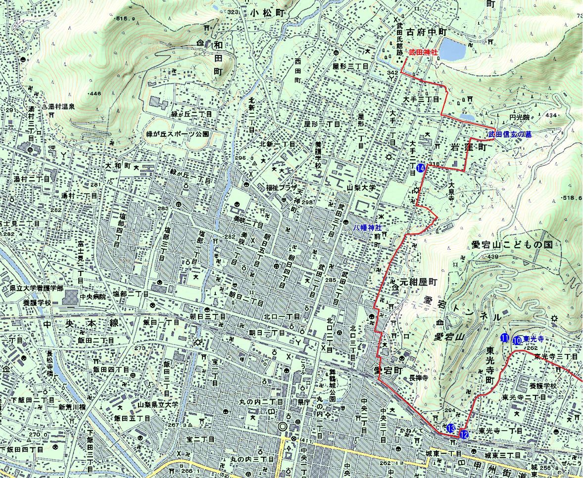 諸説ありますが、ただひとつ言えるのは、現在の「甲府」は、信玄の躑躅ヶ崎館を建立した際に「甲斐の府中(中心)」の意から甲府と命名した地名であり、律令制による府中とは異なることです。「甲斐国府」が置かれた場所として推定されているのは、