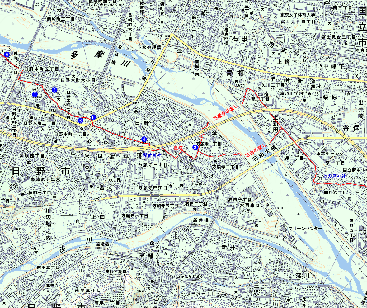 石田大橋の府中側に「三屋(さんや)」と呼ばれている地区があります。ここには、日野の石田地区と同様に土方姓が今でも多い地区です。実は、もともとは両地区は地続きだったことが理由で、