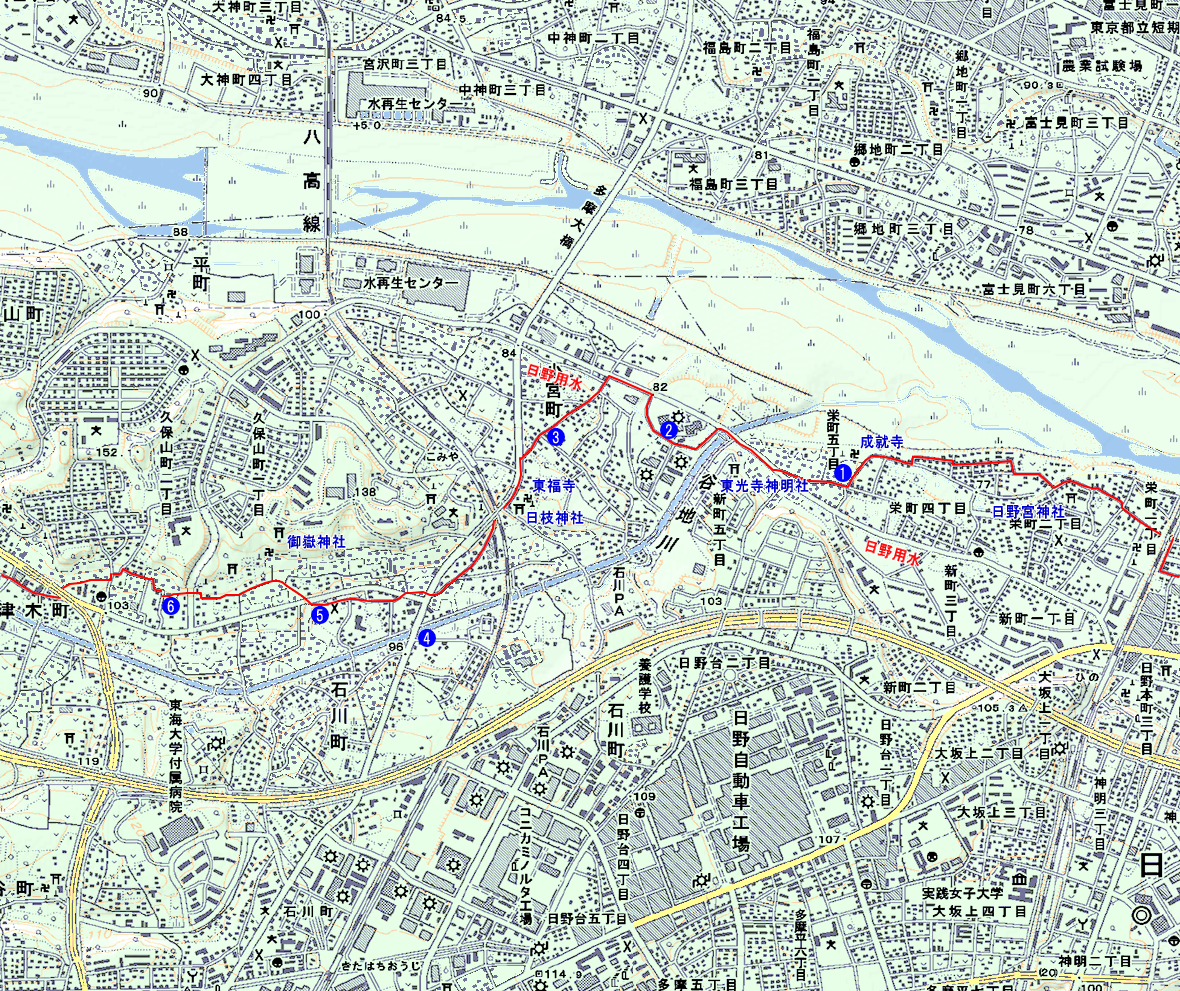 日野用水 多摩川と浅川に挟まれた日野は低地であったため、灌漑用水が必要でした。 滝山城の城主、北条氏照の命により、美濃国から移住してきた佐藤隼人が室町時代後期、永禄10年(1567)、に開削し、江戸時代には、日野本郷・万願寺村・下田村・新井村・石田村・宮村・上田村の七ヶ村を灌漑していました。 張巡らされた用水の総延長は日野市全域で170㎞にも及び、多摩の米蔵と呼ばれ、三千石ともいわれた石高をもたらしました。 現在の取水口は八王子市にある平堰で、途中で下堰掘と上堰掘に分かれ、甲州街道をはさむように流れています。