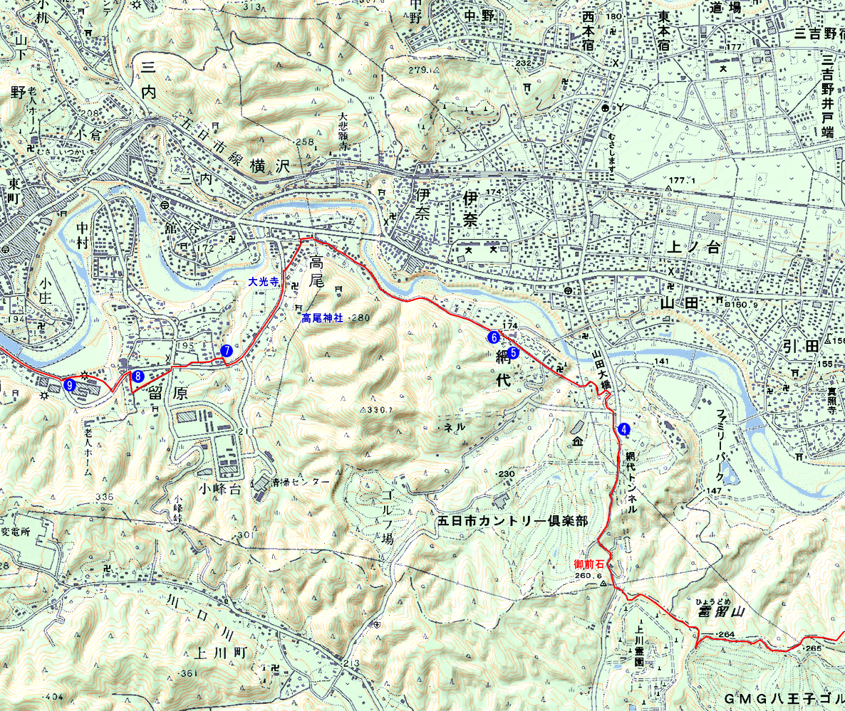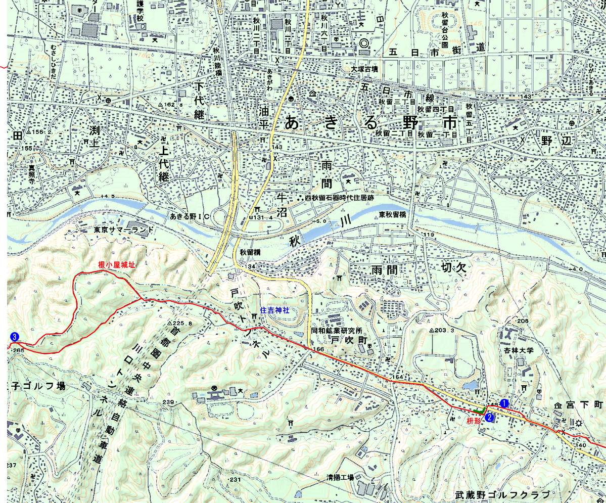 永禄一二年、甲相同盟(武田l北条)の破錠により、信玄は東へと侵攻しました。北条氏照は信玄軍に対し、秋川ルートの警備を強化し、特に檜原城の守りを最重視しました。しかし信玄配下の、小山田軍は、当時あまり踏まれていなかった(後の甲州街道)小仏峠より侵攻し、北条側は現在の高尾駅近くの廿里(とどり)の戦いにて敗れました。一方、信玄は、碓氷峠より南下し、滝山城の対岸の拝島に2万の兵を陣とり、滝山城を三の丸まで攻め込みましたが落城はできませんでした、氏照は八王子城を築城し、移城し、城下町も移しました。古甲州道に残る「八幡」「八日市」「横山」地名が、八王子の甲州街道沿いにも在る理由です。この史事から、当時の甲斐と武蔵を結ぶ道の主流は、北条氏照が警戒した、檜原の浅間尾根を通る道筋であり、小山田軍が侵攻してきた、小仏峠を越える道筋ではなかったことが推定できます。当時は、軍馬などで越えることは、想定外あったと伝えられています。