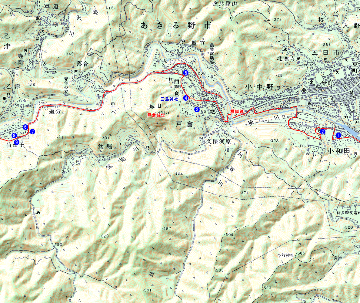 滝山城の城下を通っていた、古甲州道は、城下町特有の道筋である「枡形」を数か所、今に残しています。