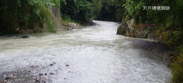 沢戸橋 古甲州道は、現在の西秋川橋と新沢戸橋の間(旧沢戸橋)付近を板橋にて渡っていました。今でも、旧沢戸橋の橋脚跡が岩盤に残るが、この地点が川幅も狭く、橋を架けるには絶好の場所ではなかったのかと思われます。古甲州道は、秋川の右岸を、「上ッかま」と呼ばれる秋川の淵の上から、西戸倉へと通っていました。