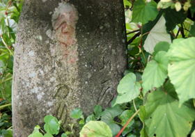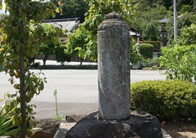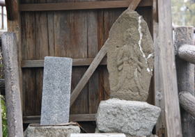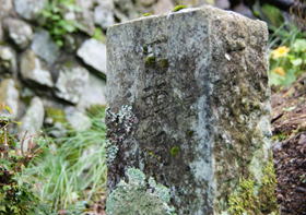 人里道標 「右ハ山道」「左ハ川のり」と刻む。人里は、上野原、西原との交通の要所であったとともに人的交流もあり、西原から人里へと嫁いだ人も多い。檜原村の資料によると、人里には、他にも2基、道標石仏が確認されています。