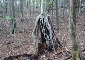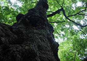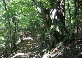 牛の寝通り 5㎞ほどのほとんど平坦で車も通行できそうな幅の広い尾根道が続く。巨木・奇木が乱立した原生林。まさに、原生林を貫ける生活道です。