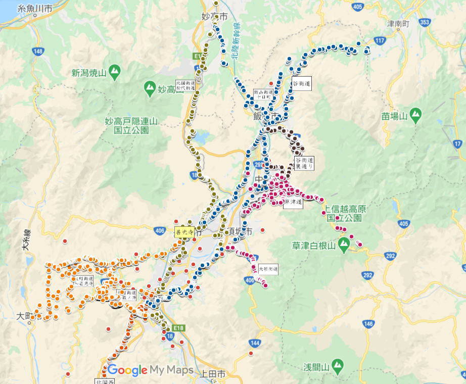 | 古道あるきは、「石仏のオリエンテーリング」 GoogleMAPのGPS機能を利用して、善光寺まで歩きましょう。 下記GoogleMAPを石仏のオリエンテーリングにご利用できます。 街道毎に色が異なります。