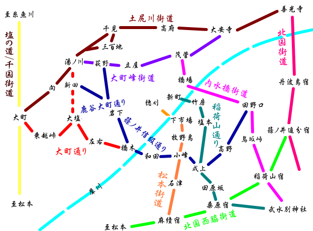 | 供養塔 | 土尻橋 美麻湯の海より、峰伝につけられた道は、この土尻橋にてはじめて土尻川を渡る。善光寺までは、あと裾花川を渡るのみで、千曲川、支流の犀川を渡ることなく、大町と善光寺を結ぶことができる街道であった。 | |||